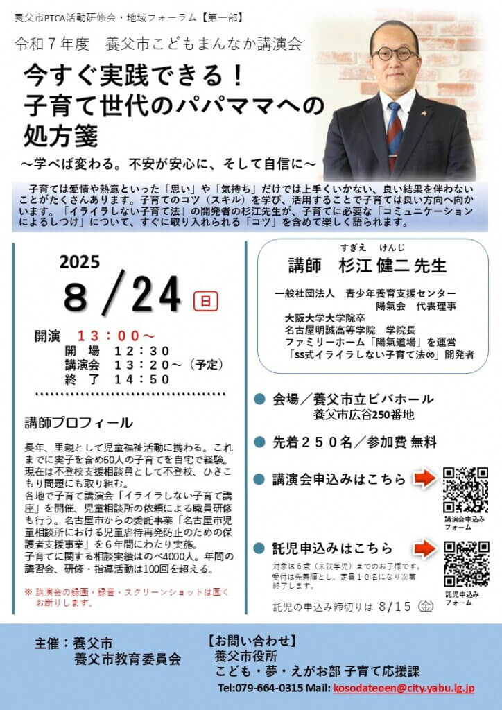 兵庫県養父市で開催される「令和7年度 こどもまんなか講演会」に、当会代表理事の杉江健二が講師として登壇いたします。