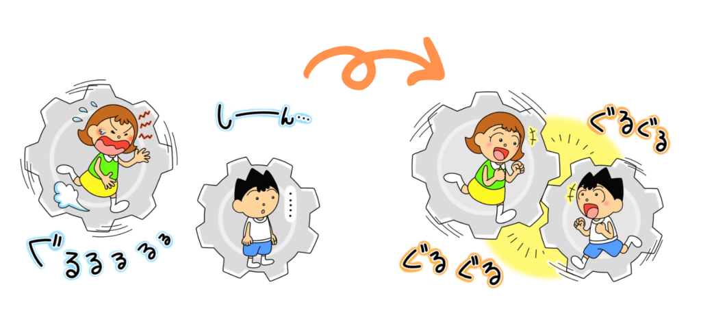 子育てのベースを親子間のやり取りに置き、親子の信頼関係(親子間のコミュニケーションの歯車)を上手く噛み合わせることを目指します。