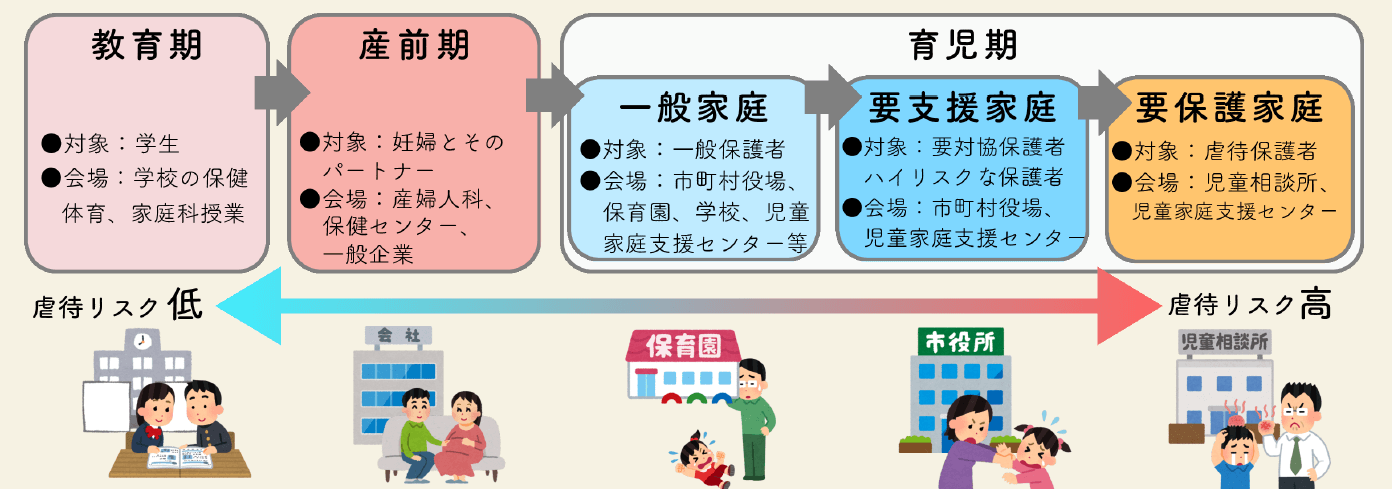 *包括的子育て学び支援:当会では、児童虐待防止の観点から「包括的子育て学び支援事業」を展開しています。本事業は、「教育期」から「育児期」まで、切れ目なく子育てを学ぶ機会を提供し、児童虐待の防止を目指す事業です。「教育期・産前期」を親準備期間と捉え、将来の子育てに対する不安を軽減し、虐待を「しない」子育てを身につけるよう、子育てを学ぶ機会を提供します。「育児期」の子育てに困難を抱える家庭には、具体的な知識やしつけの方法を伝えることで、不適切な養育を未然に防いだり、虐待が発生した家庭では、再発防止を目指します。どのタイミングでも子育てを学ぶことができる環境を整え、児童虐待の本質的な解決を目指す点が、本事業の大きな特徴です。